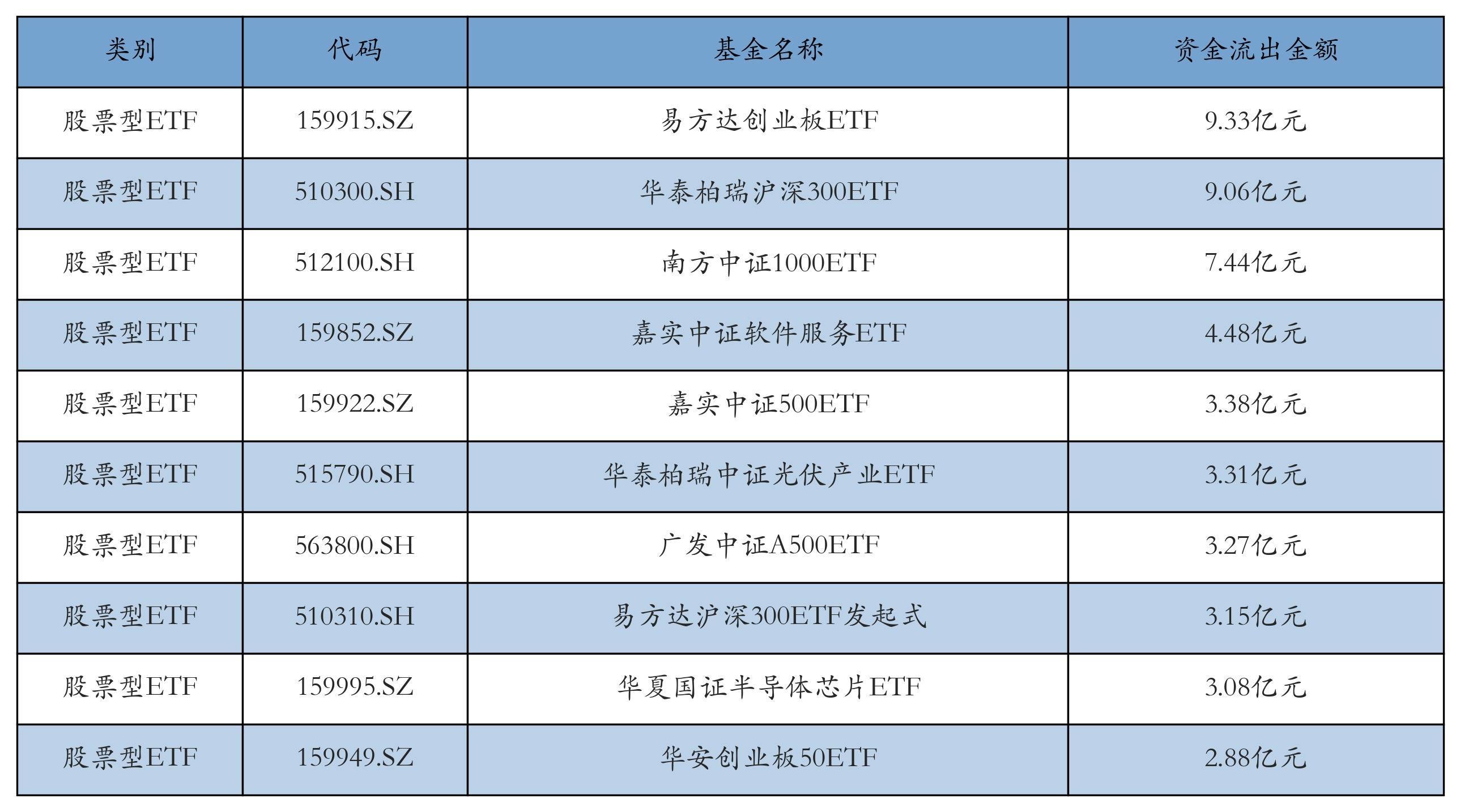 昨日股票型ETF资金流出最多的3只ETF及其流出金额分别为:易方达创业板ETF(流出9.33亿元)、华泰柏瑞沪深300ETF(流出9.06亿元)、南方中证1000ETF(流出7.44亿元)。资金流出前10详情见下表: