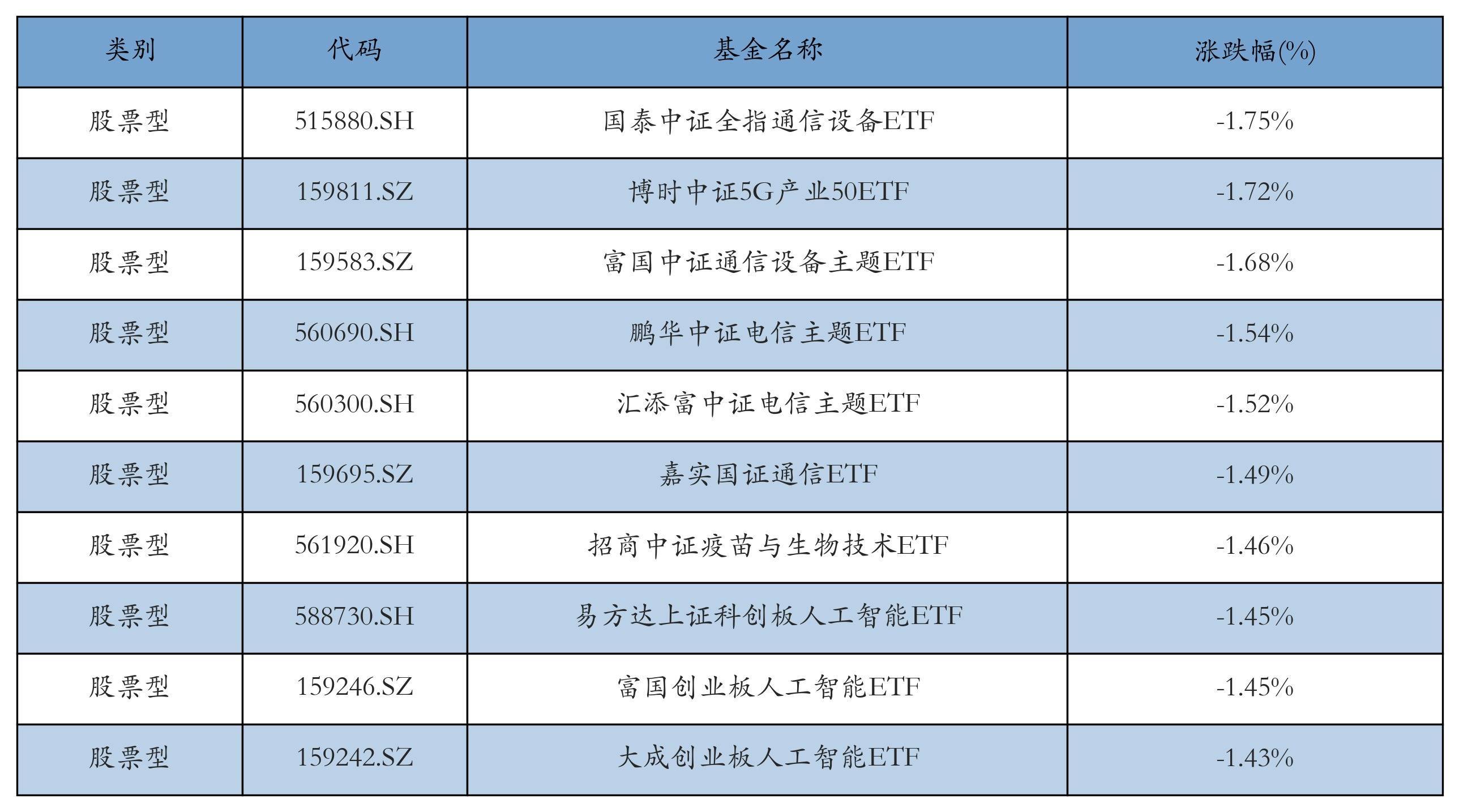 昨日股票型ETF跌幅最大的3只ETF及其收益率分别为:国泰中证全指通信设备ETF(-1.75%)、博时中证5G产业50ETF(-1.72%)、富国中证通信设备主题ETF(-1.68%)。跌幅前10详情见下表: