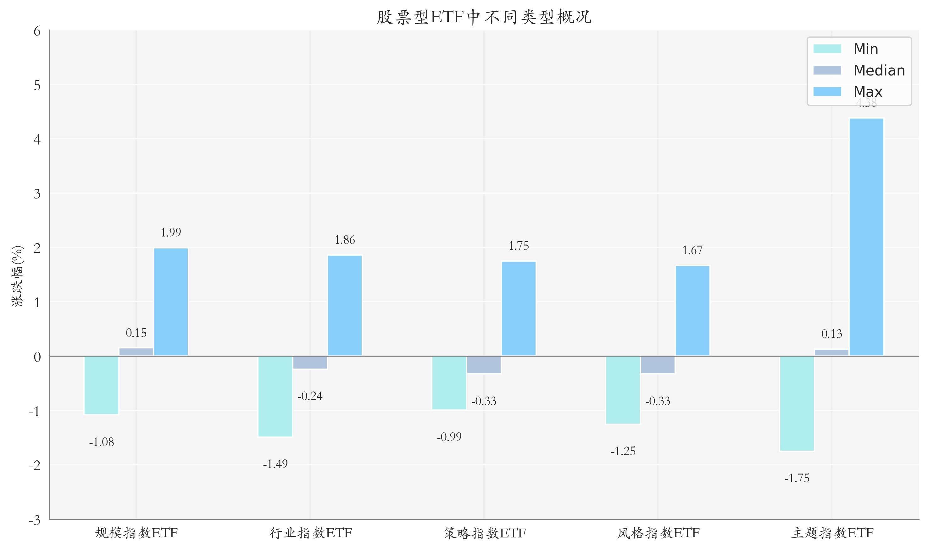 二、ETF市场表现1、股票型ETF整体市场表现昨日股票型ETF收益率中位数为0.0%。其中按照不同分类,规模指数ETF中嘉实创业板50ETF收益率最高,为1.99%;行业指数ETF中国泰中证800汽车与零部件ETF收益率最高,为1.86%;策略指数ETF中华夏创业板低波价值ETF收益率最高,为1.75%;风格指数ETF中博时国证大盘成长ETF收益率最高,为1.67%;主题指数ETF中华夏中证动漫游戏ETF收益率最高,为4.38%。