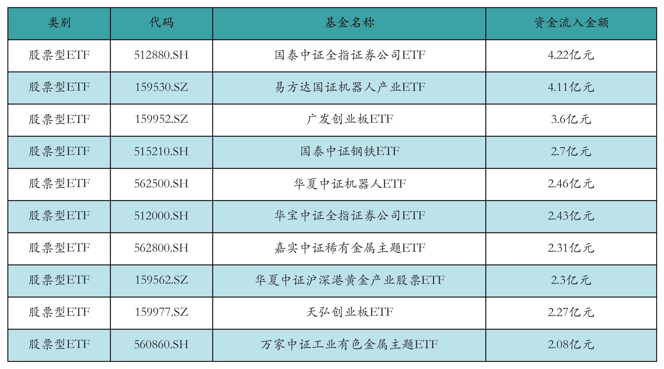 昨日股票型ETF资金流入最多的3只ETF及其流入金额分别为:国泰中证全指证券公司ETF(流入4.22亿元)、易方达国证机器人产业ETF(流入4.11亿元)、广发创业板ETF(流入3.6亿元)。资金流入前10详情见下表: