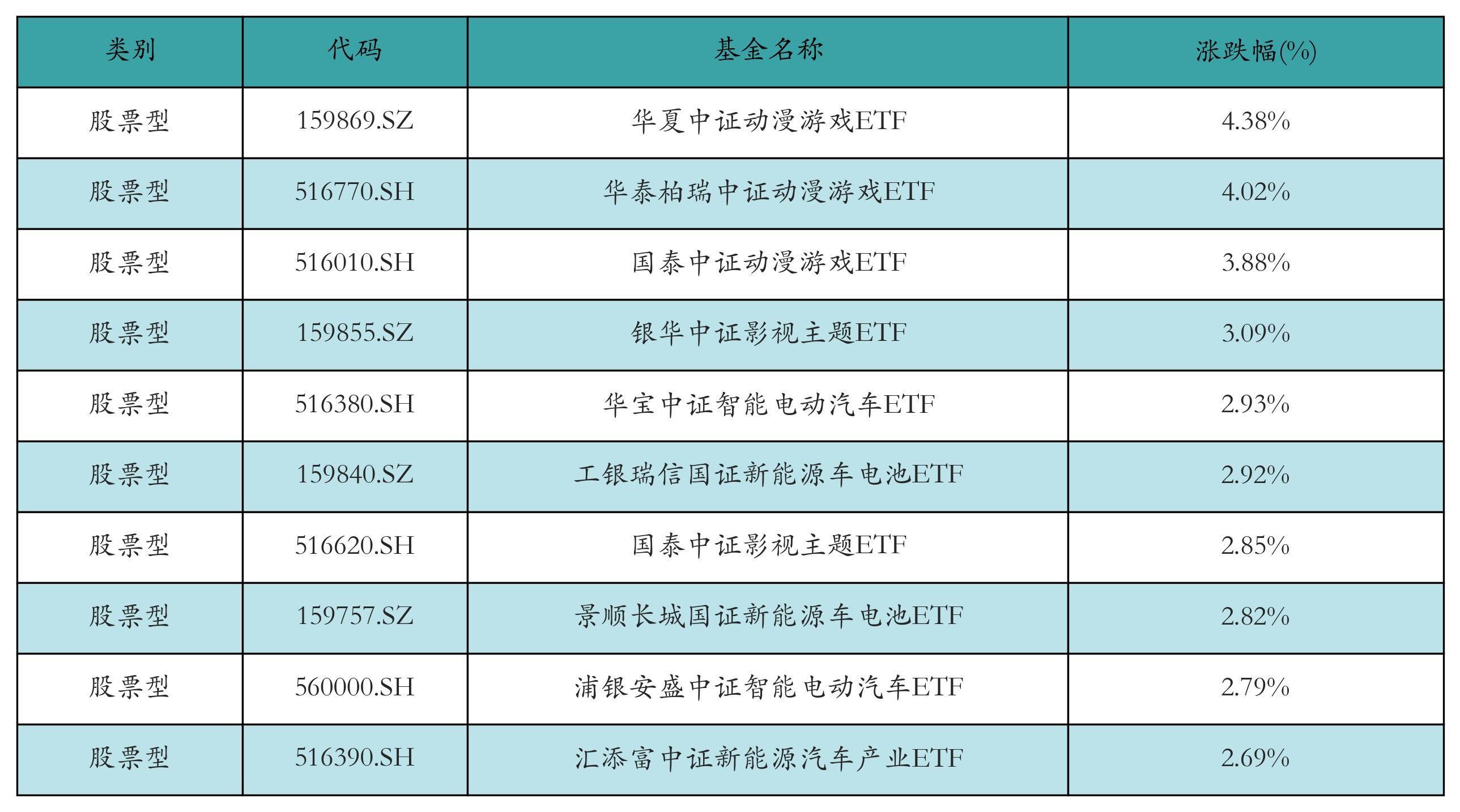 昨日股票型ETF涨幅最高的3只ETF及其收益率分别为:华夏中证动漫游戏ETF(4.38%)、华泰柏瑞中证动漫游戏ETF(4.02%)、国泰中证动漫游戏ETF(3.88%)。涨幅前10详情见下表: