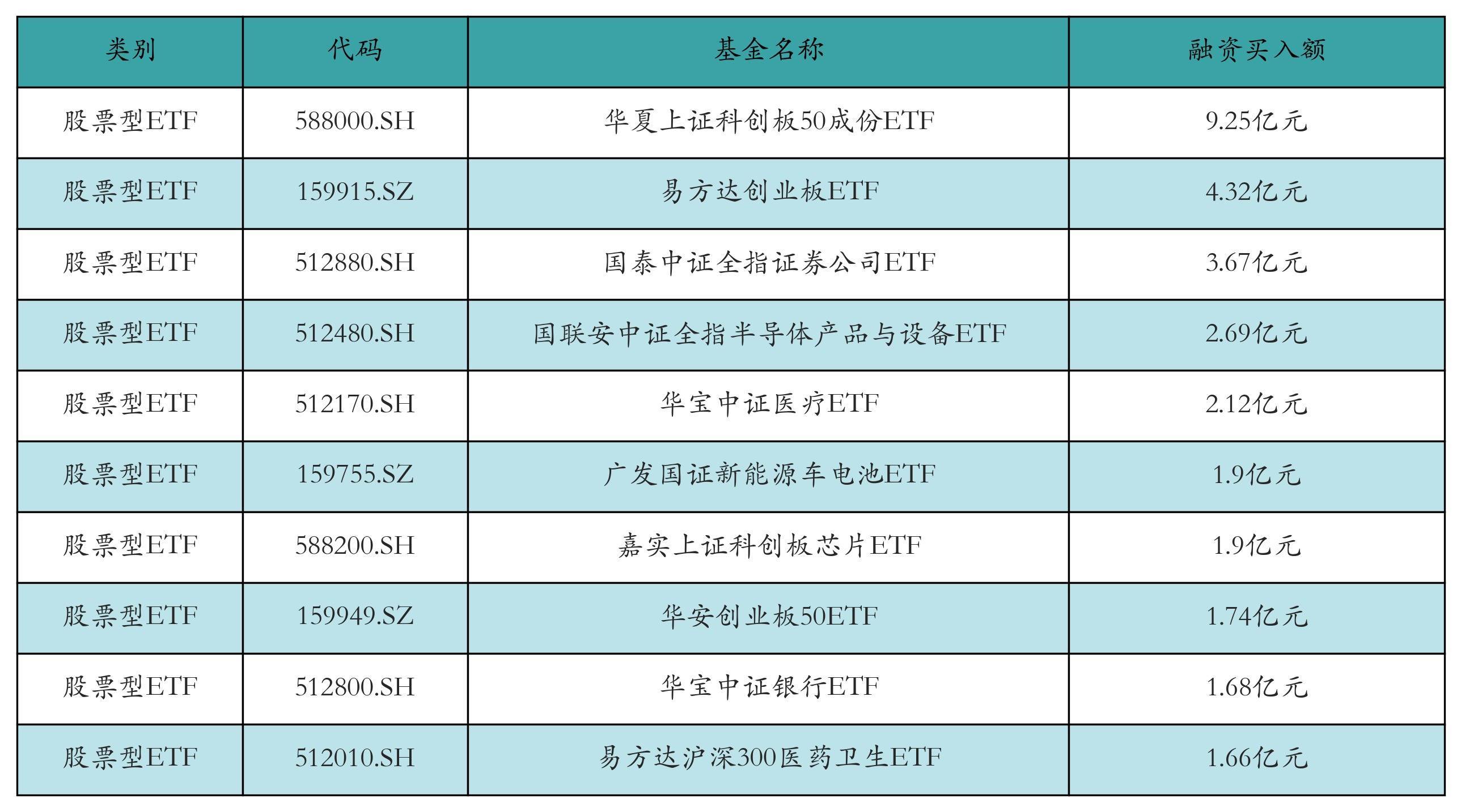 昨日股票型ETF融资买入额最高的3只ETF及其买入金额分别为:华夏上证科创板50成份ETF(9.25亿元)、易方达创业板ETF(4.32亿元)、国泰中证全指证券公司ETF(3.67亿元)。融资买入额前10详情见下表: