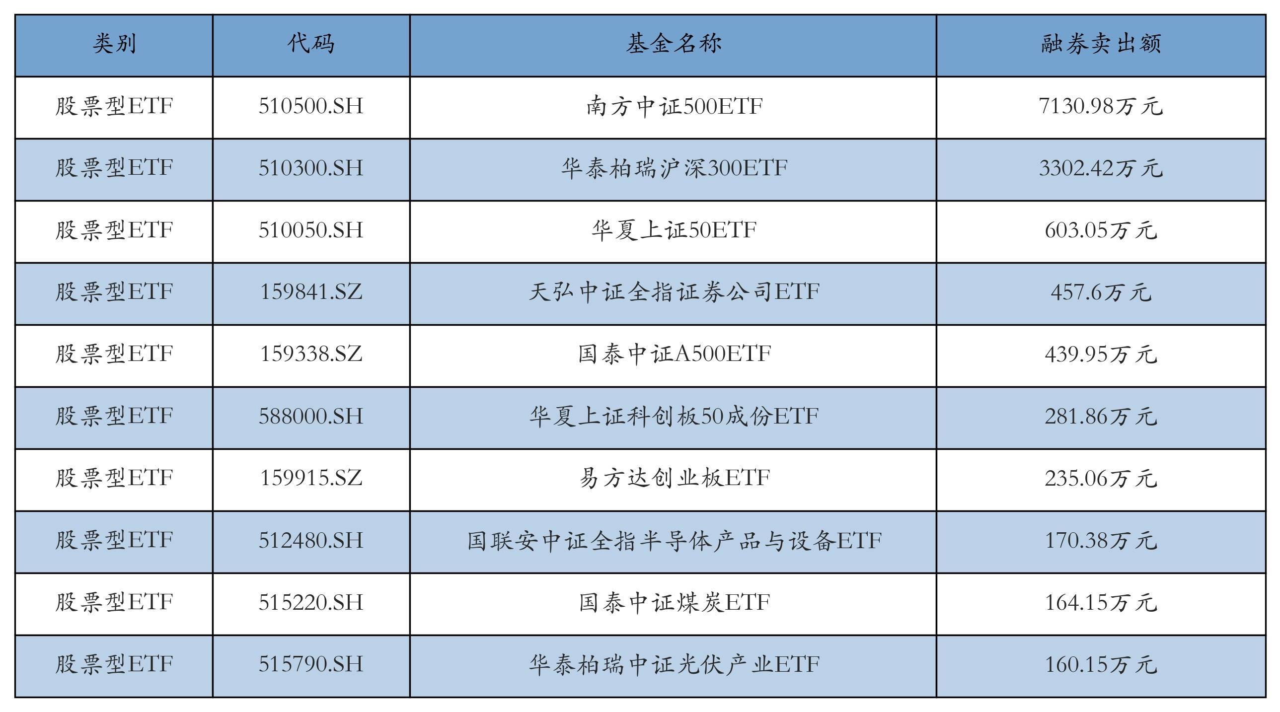 昨日股票型ETF融资卖出额最高的3只ETF及其卖出金额分别为:南方中证500ETF(7130.98万元)、华泰柏瑞沪深300ETF(3302.42万元)、华夏上证50ETF(603.05万元)。融券卖出额前10详情见下表:
